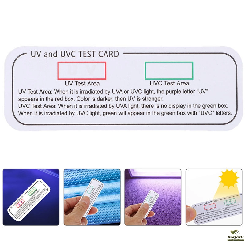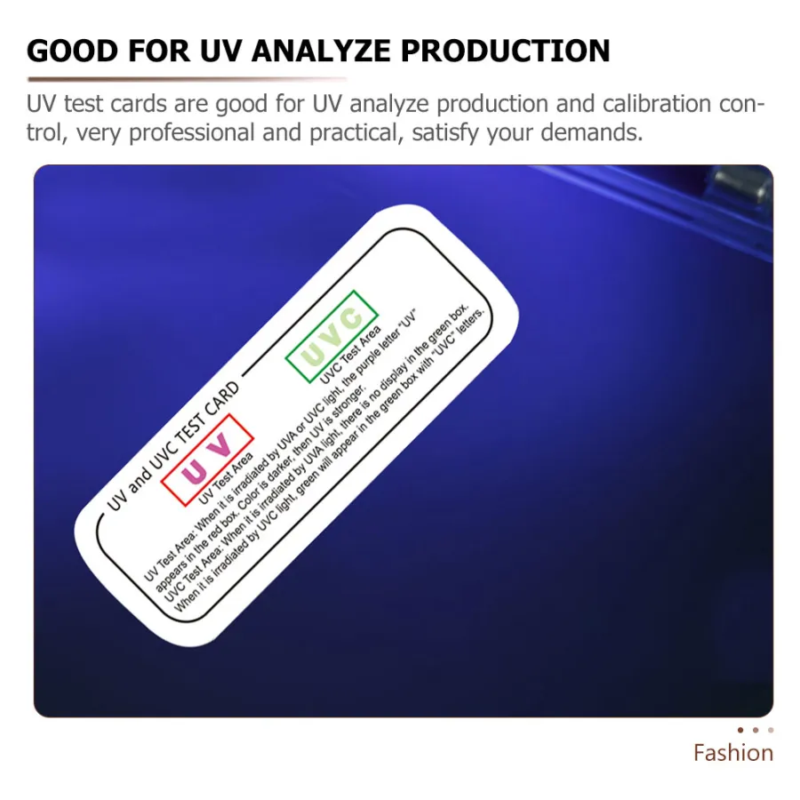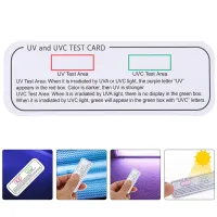 UVA and UVC test cards are designed with a UVC test area and UV test area, Easy to use, when it is irradiated by UVA lighting, there is no display in the green area. When it is irradiated by UVC lighting, green could appear in a green area with "UVC" letters.