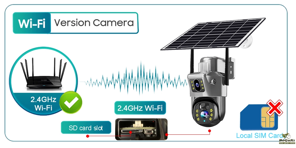 WiFi version camera only supports 2.4Ghz WiFi, built in SD card slot.