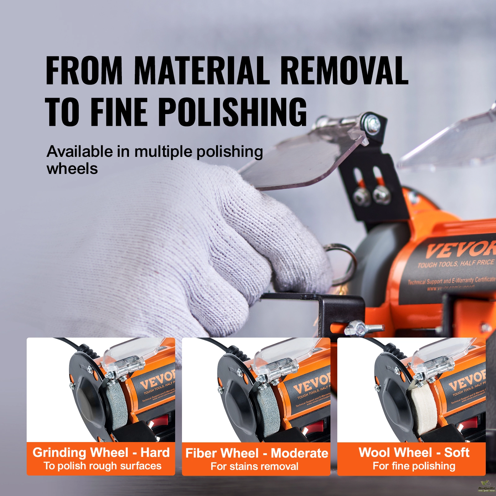 3 Polishing Wheels: This bench buffer comes bundled with a soft wool wheel, a moderate fiber wheel, and a hard grinding wheel. These three hardness polishing wheels help you polish a wide range of gemstones and metals. All can be done, whether rough buffing surfaces, fine polishing, or removing rust.