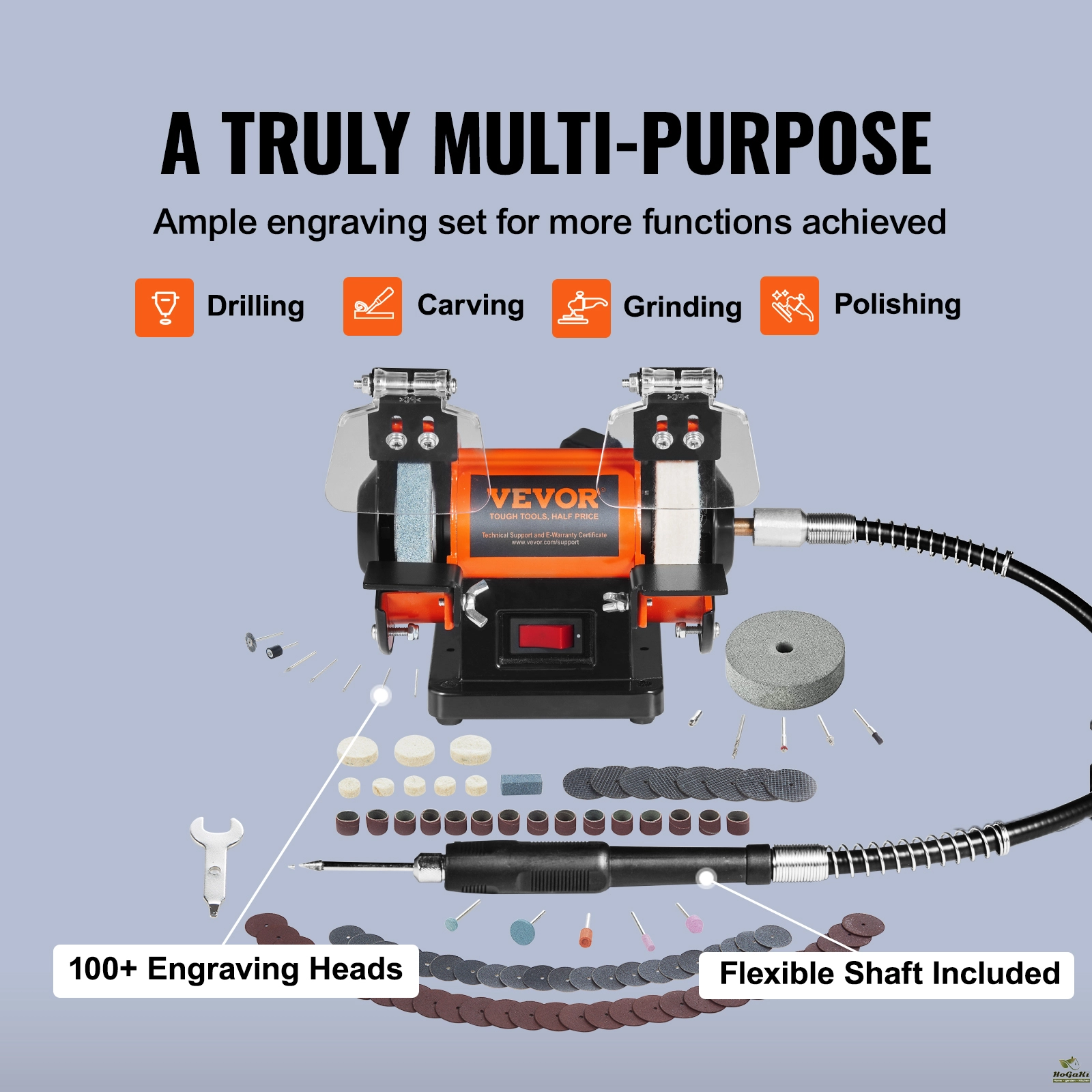 100+ Accessories: 100pcs of sculpting accessories can meet your various rough and fine engraving needs. Our benchtop buffer polisher is applied to burnish and polish diversified gemstones, metals, rusts, and wood drilling. One device meets many needs.