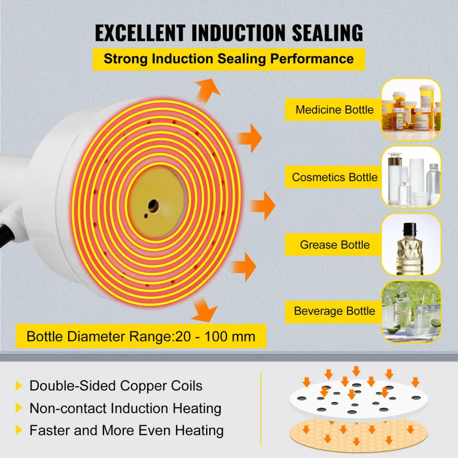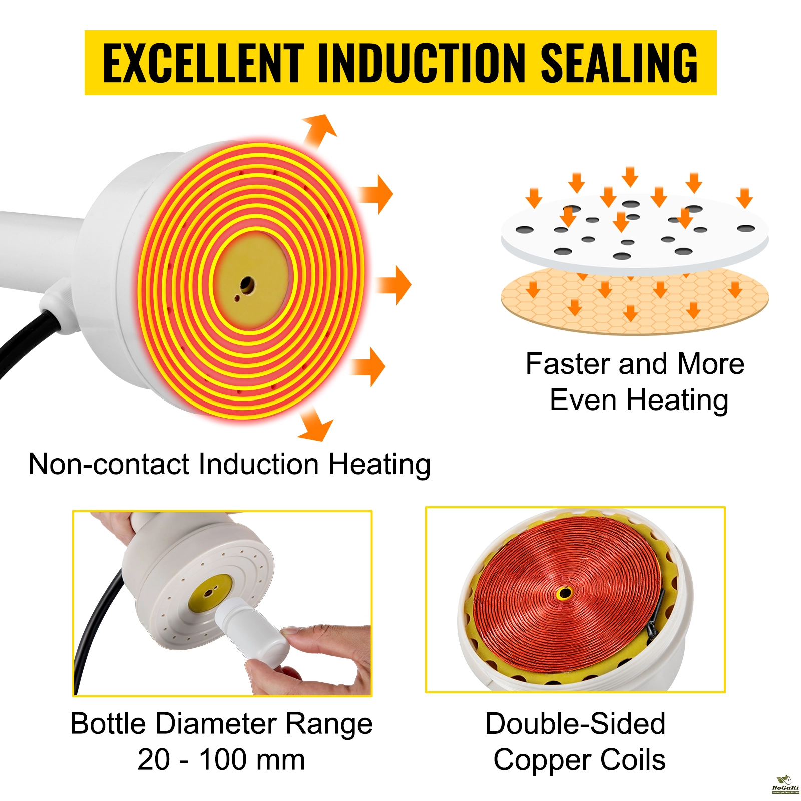 Excellent Performance: The handled induction sealer machine adopts electromagnetic induction heating, sealing the bottle efficiently. 1min=5~20 bottles. It can seal bottles with various capsizes from 20 mm to 100 mm. The sealer's sealing power is 500W, which can be adjusted according to the demand.