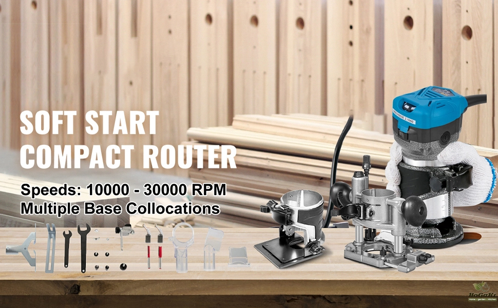 Our brand new Soft Start Compact Router Kit is designed for wide applications in wood processing, furniture manufacturing and other industries. No Load Speed: 10,000-30,000RPM, 6 variable speeds. Soft starting motor works with 710W, voltage 110V/220V. Durable and accurate designed body.