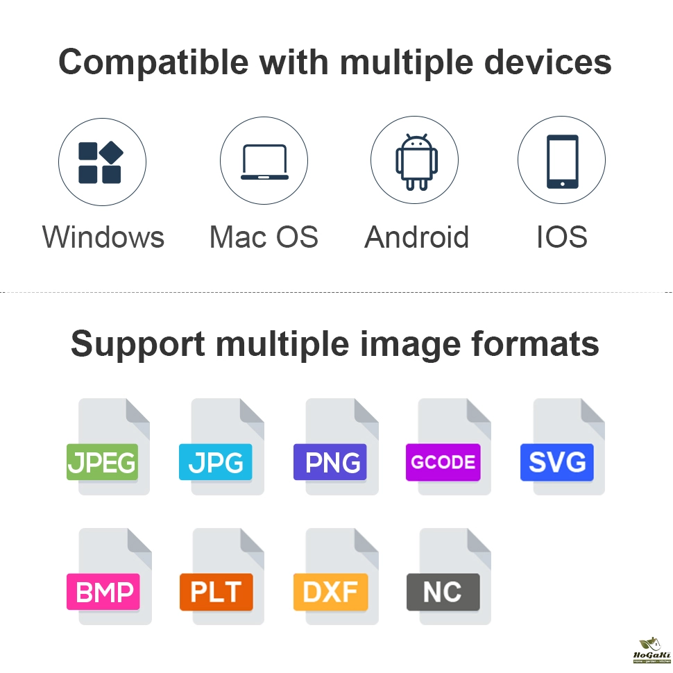Our K6 model is compatible with all operation systems in the market, like Window7/8/10 and Mac OS, connected by USB cable, plug and play; besides, through Bluetooth connection, you can use a cellphone easy to control the machine, our self-developed application(for free in life), beginner-friendly operation interface, support picture/photograph/text/drawing/QR code 5 modes to engraving and cutting, format not limited to JPG/JPEG/BMP/DXF and so on
