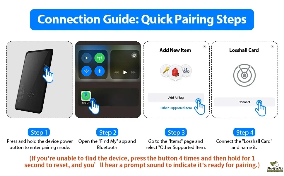 Note: Device enters pairing mode for 10 minutes after power-on. Reset if pairing fails.