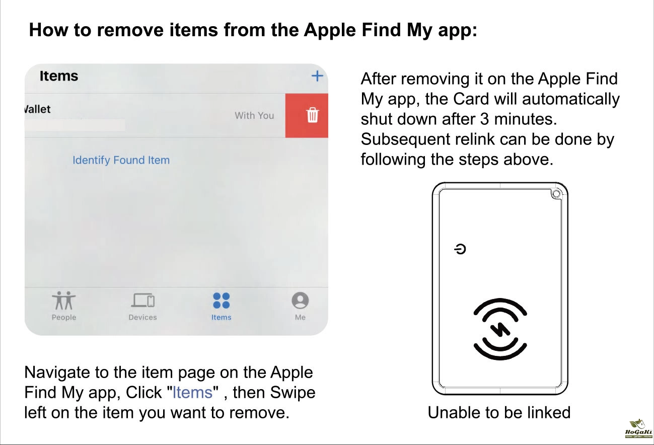 Find My app → Select locator → Swipe up → Tap "Remove Item" → Confirm