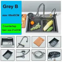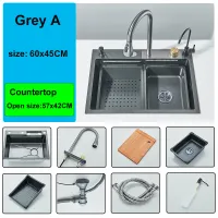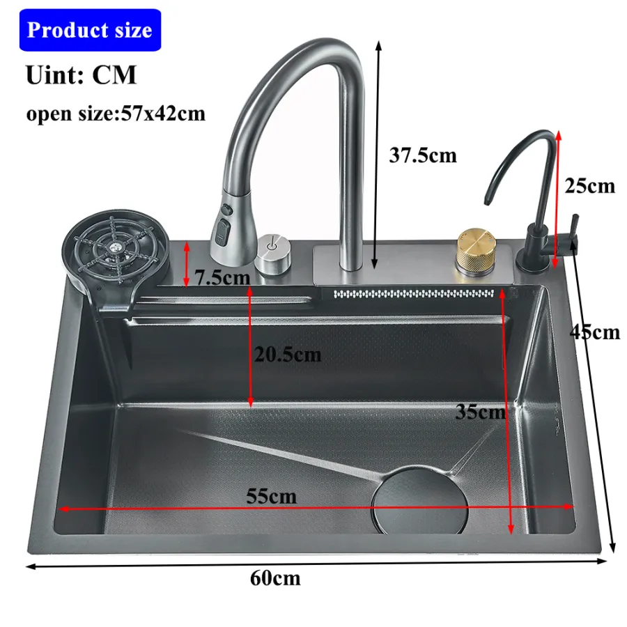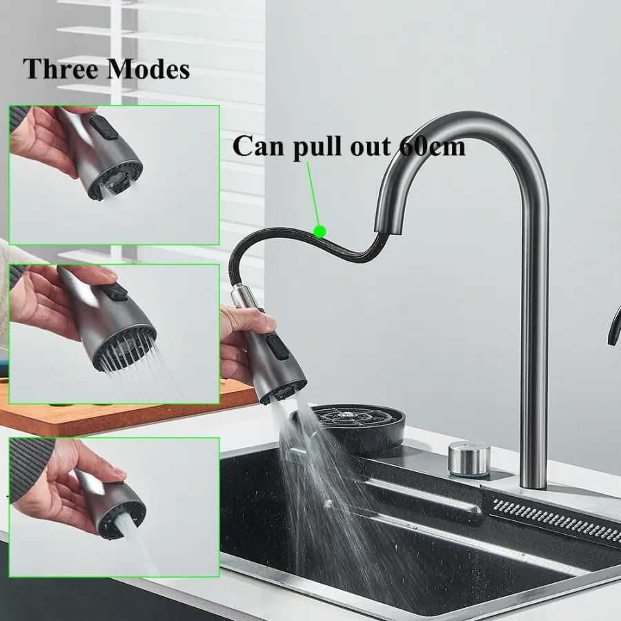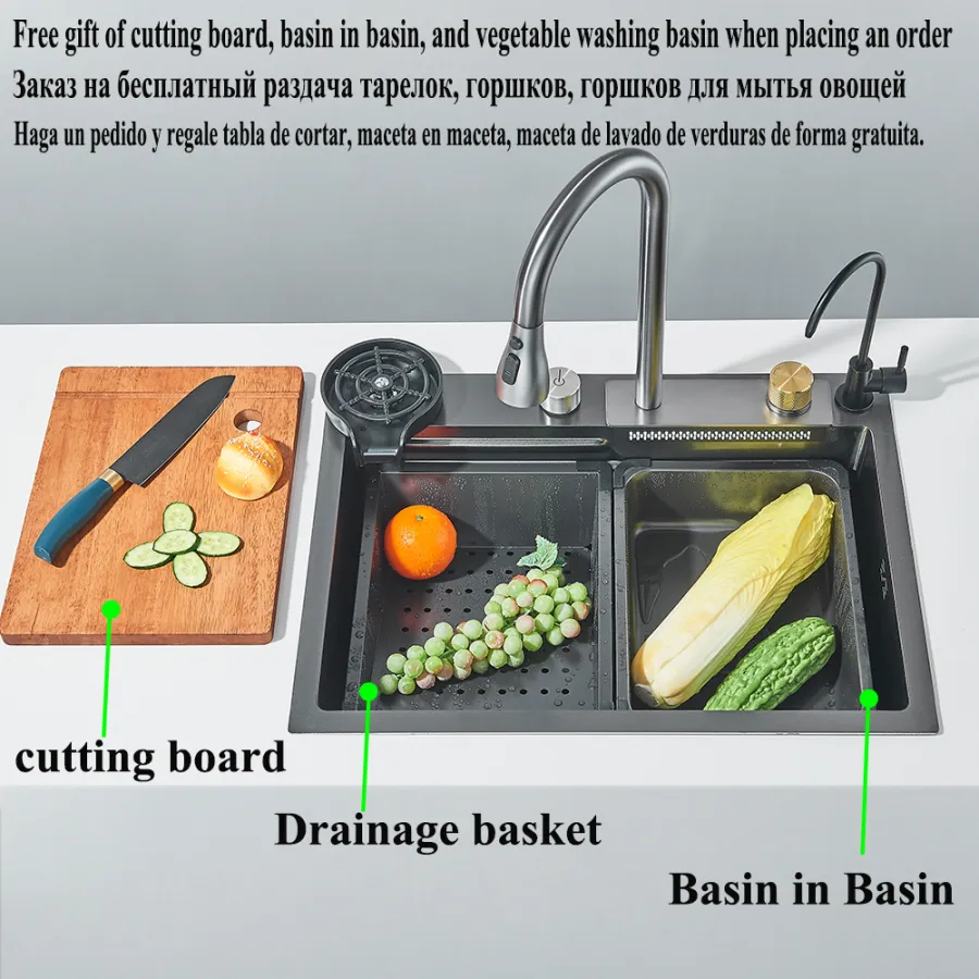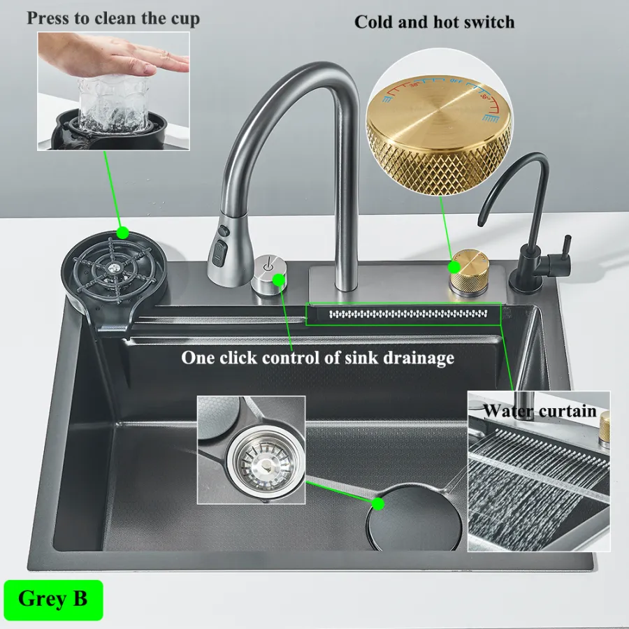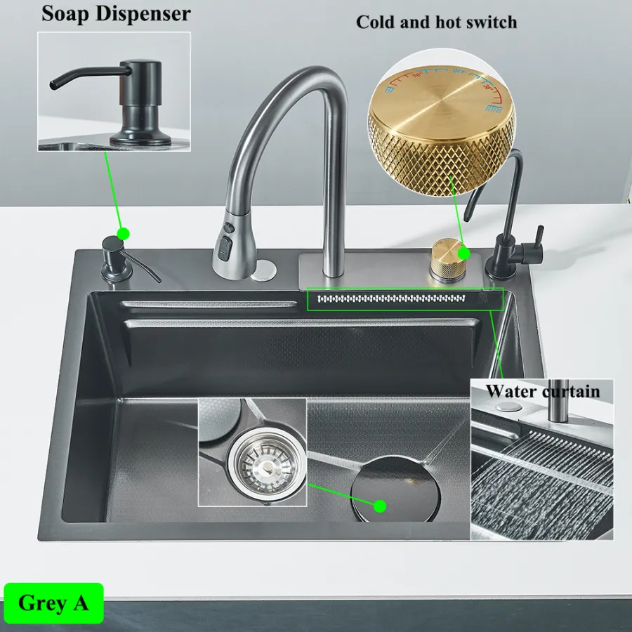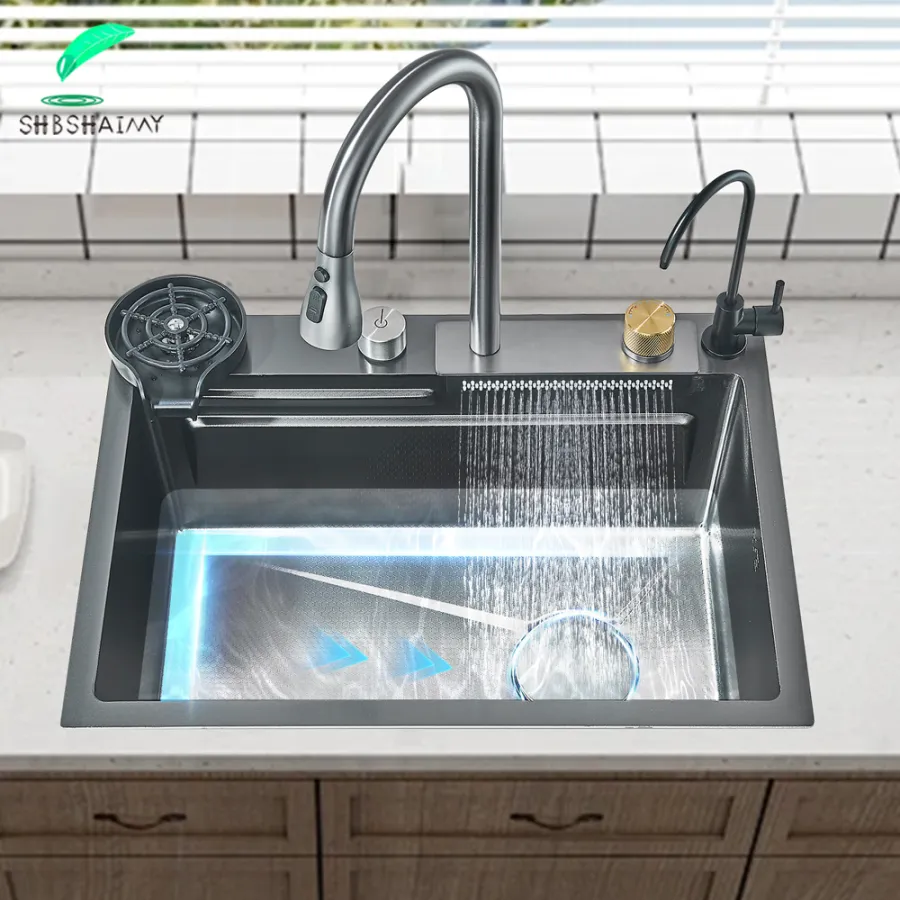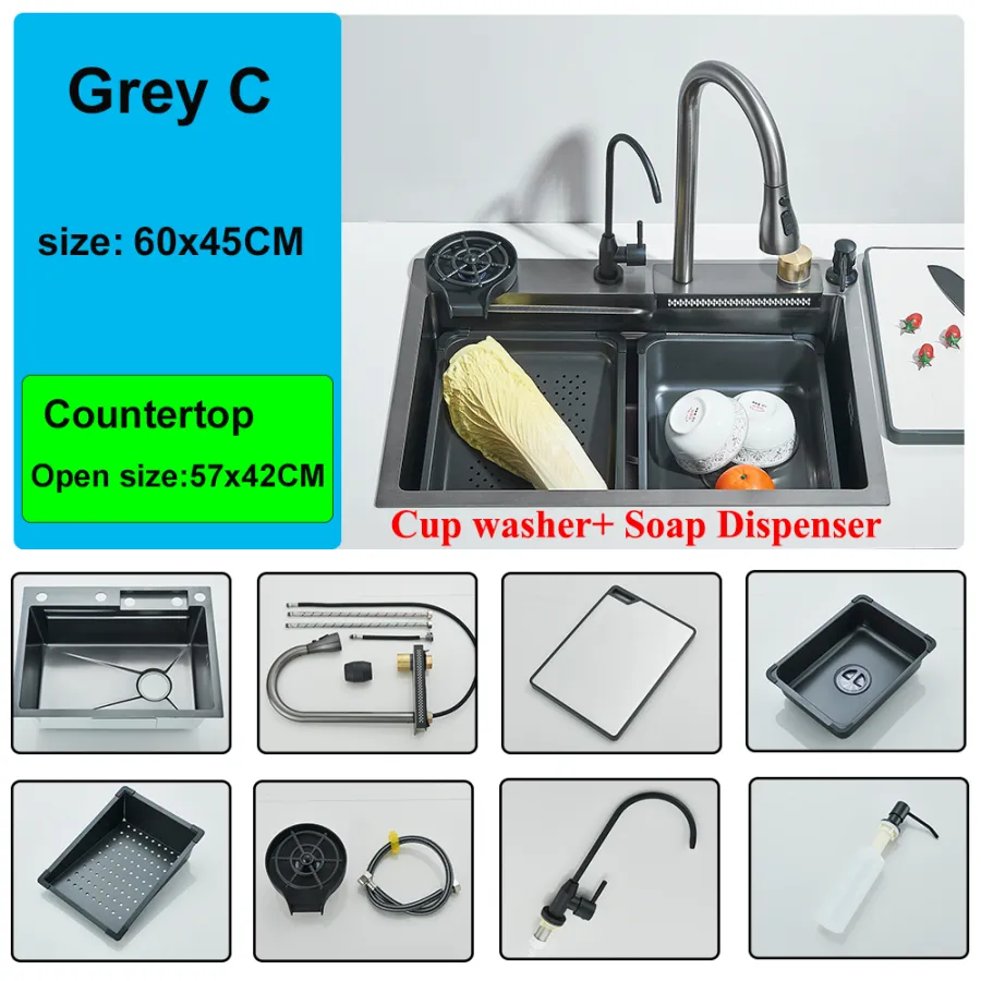 describe:Waterfall Kitchen Sink 304 Stainless Steel  Large Single Slot Integrated  Faucet Set Soap Dispenser Cup washer With Fancet.We have two styles for buyers to choose from, the difference being that one has a soap dispenser and the other is a cup washer.