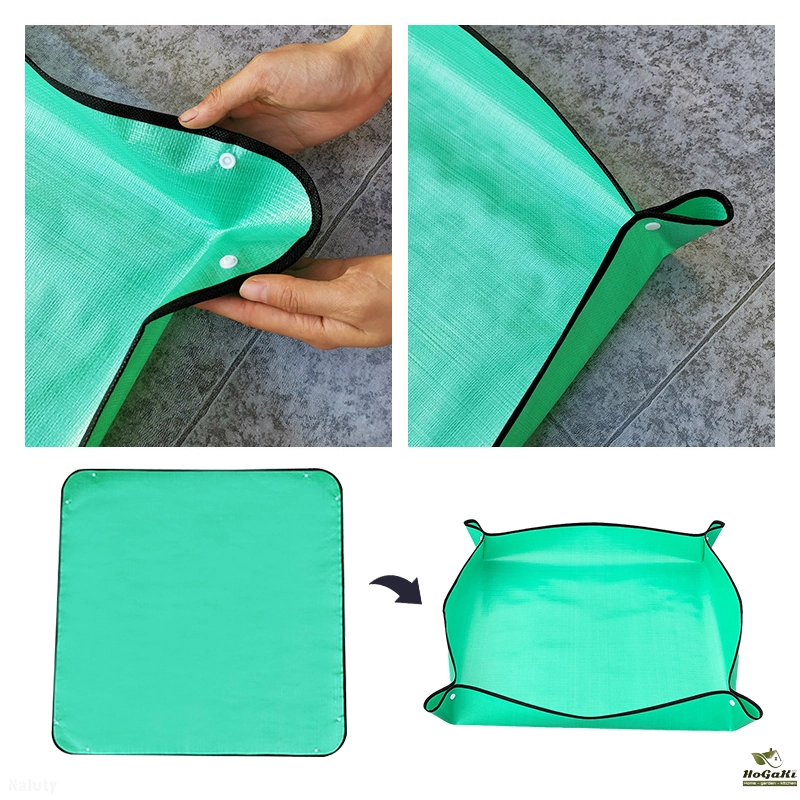 Leak Proof Design: each of the four corners has two copper poppers, just use the poppers to close the corner so that you can fold the mat into shape, which can easily prevent water and soil from leaking out, keep floor or tabletop clean.