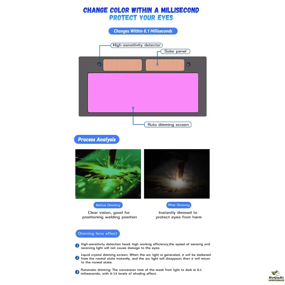 2. Automatic dimming welding mask, eye protection, high detection sensitivity, fast detection light change speed. The field of vision is very clear before darkening, and the welding position can be accurately positioned. When you dim, it immediately darkens, filtering harmful light and protecting your eyes from damage.