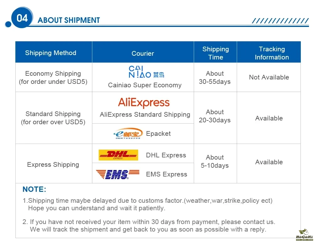 Packages from our warehouse in China will be shipped by ePacket or EMS depending on the weight and size of the product. Packages shipped from our US warehouse are shipped through USPS.