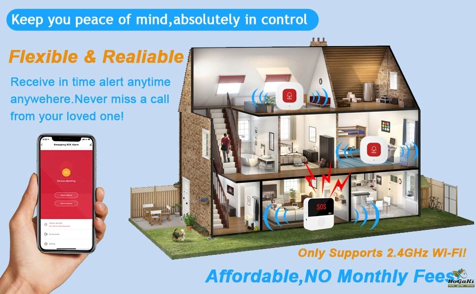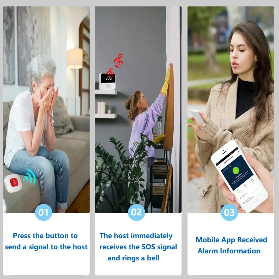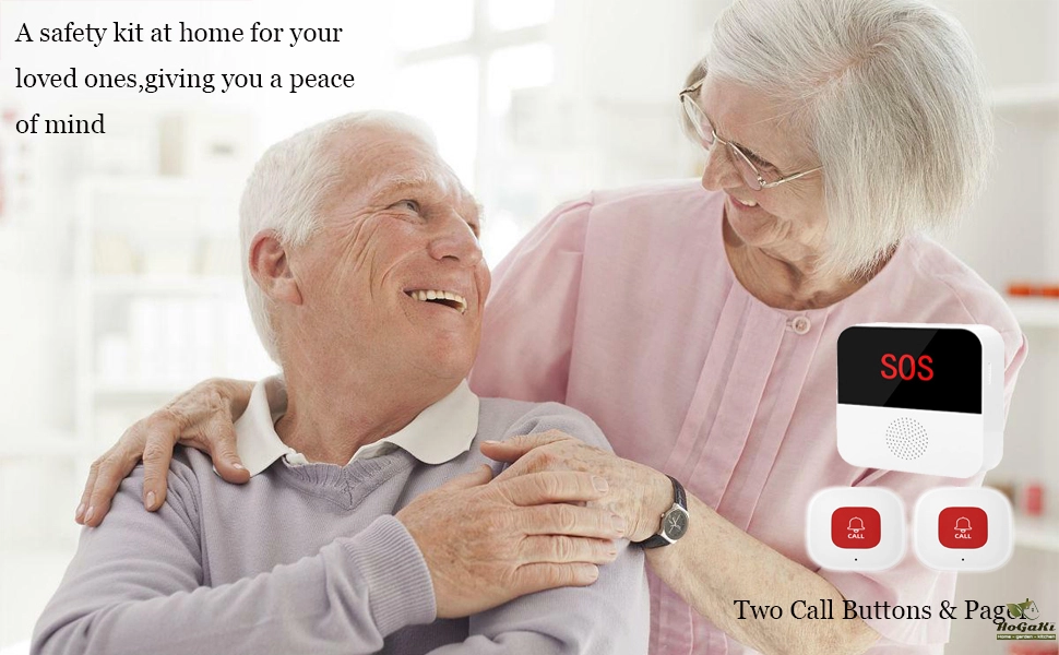 [Audible/Visual Dual Alarm] When pressing the life caregiver call button in case of emergency, the caregiver pager will sound an alarm when it receives the signal, and the built-in LED indicator in the SOS area will flash red to alert the caregiver. The emergency alert system has 12 types of ring tones to choose from and 4 adjustable volume levels from 0db to 90db. A silent mode with LED flashing is available.
