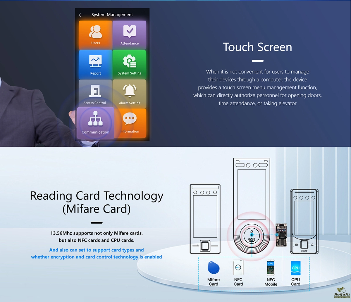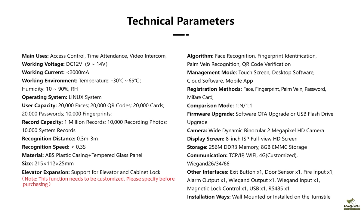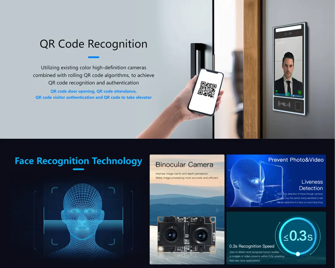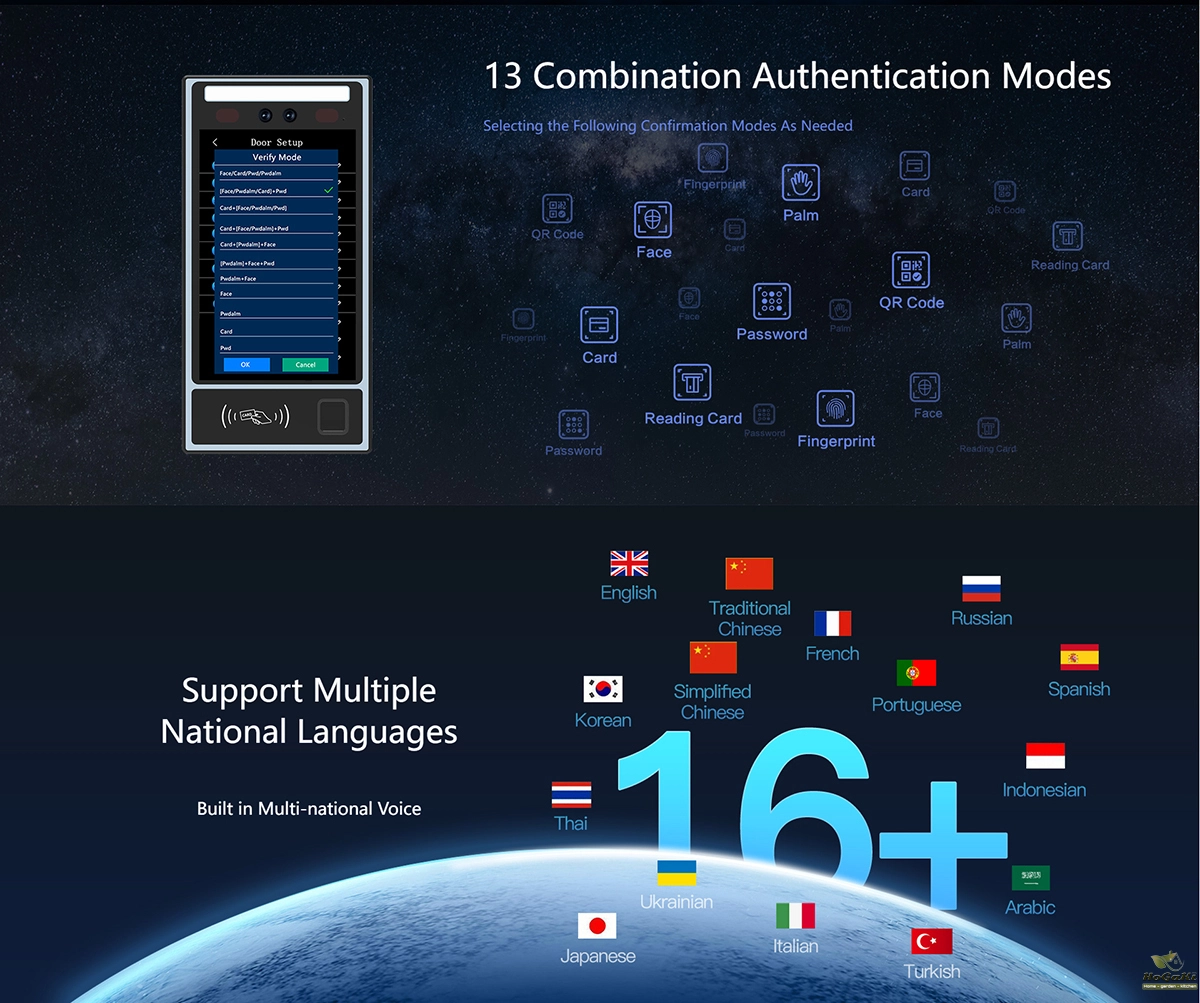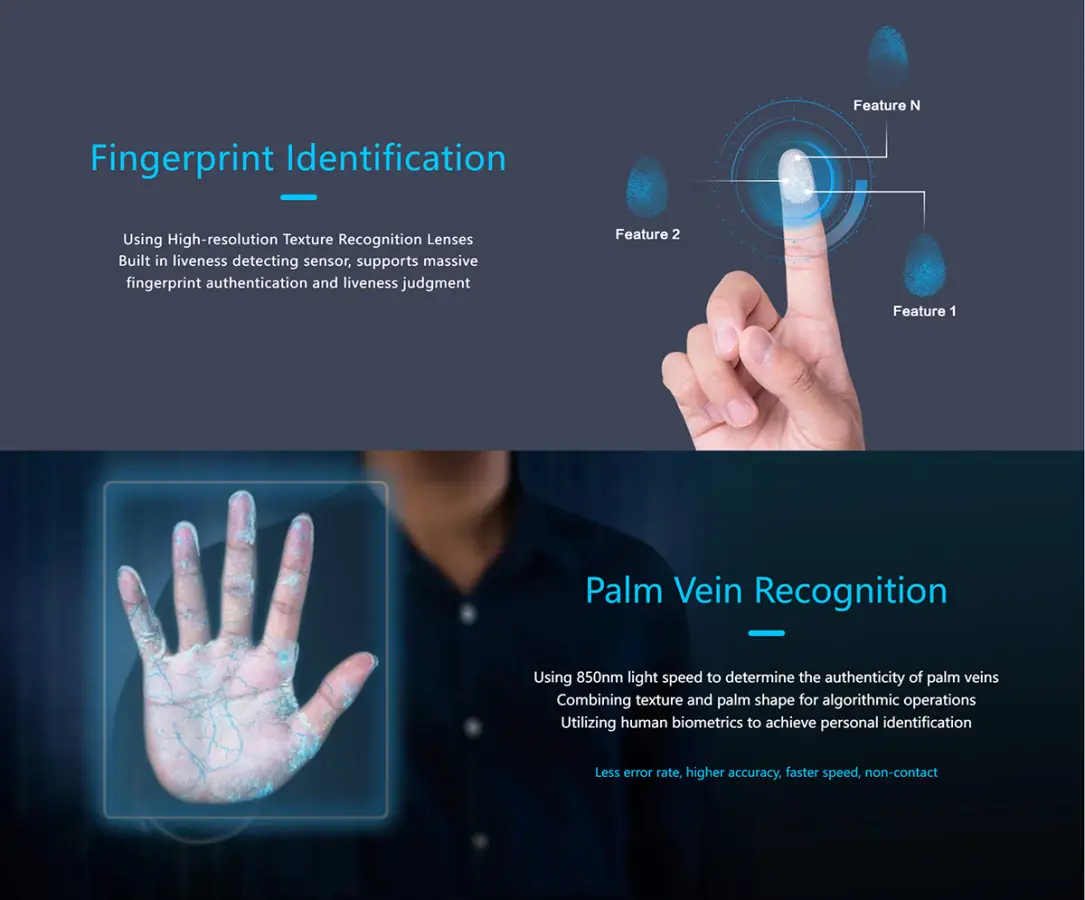 Registration Methods:Face, Fingerprint, Palm Vein, Password,Mifare card,QR Code.