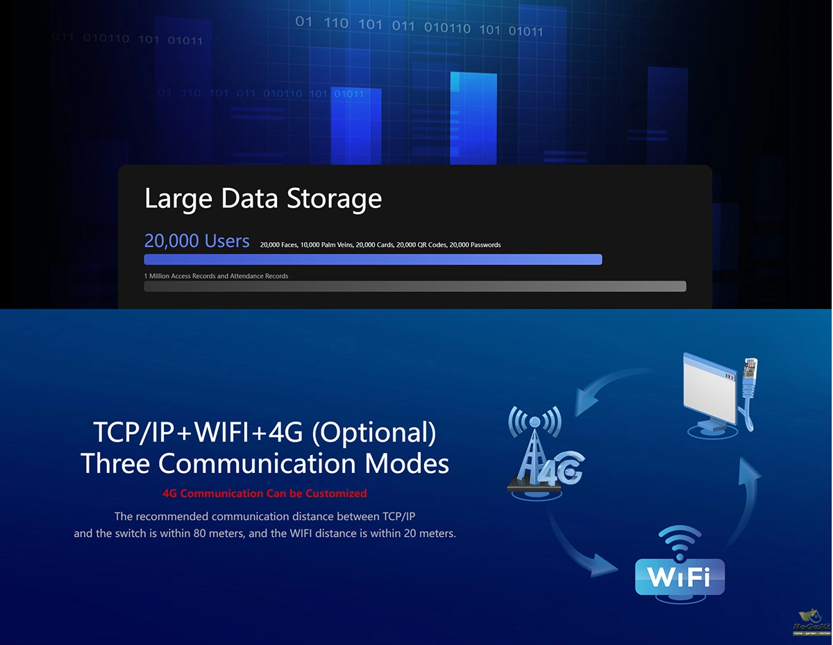 User Capacity:20,000 Faces;20,000 QR Codes;20,000 Cards;20,000 Passwords;10,000 Fingerprints.