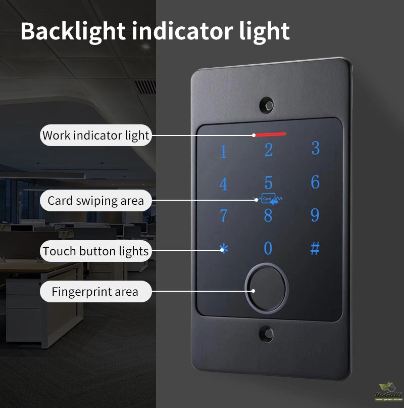 This product is a metal ip66 grade waterproof fingerprint access control machine also can be a card reader, zinc alloy shell, explosion-proof and skid proof, IP66 waterproof grade, suitable for outdoor use. Support 200 fingerprints/880 fingerprints+2120 card users, with fingerprint door opening, card door opening, password door opening and multi-user door opening. It supports visitor users, can be set as a professional card reader, can upload/download card or password user data, and has door status detection; Machine anti disassembly function.