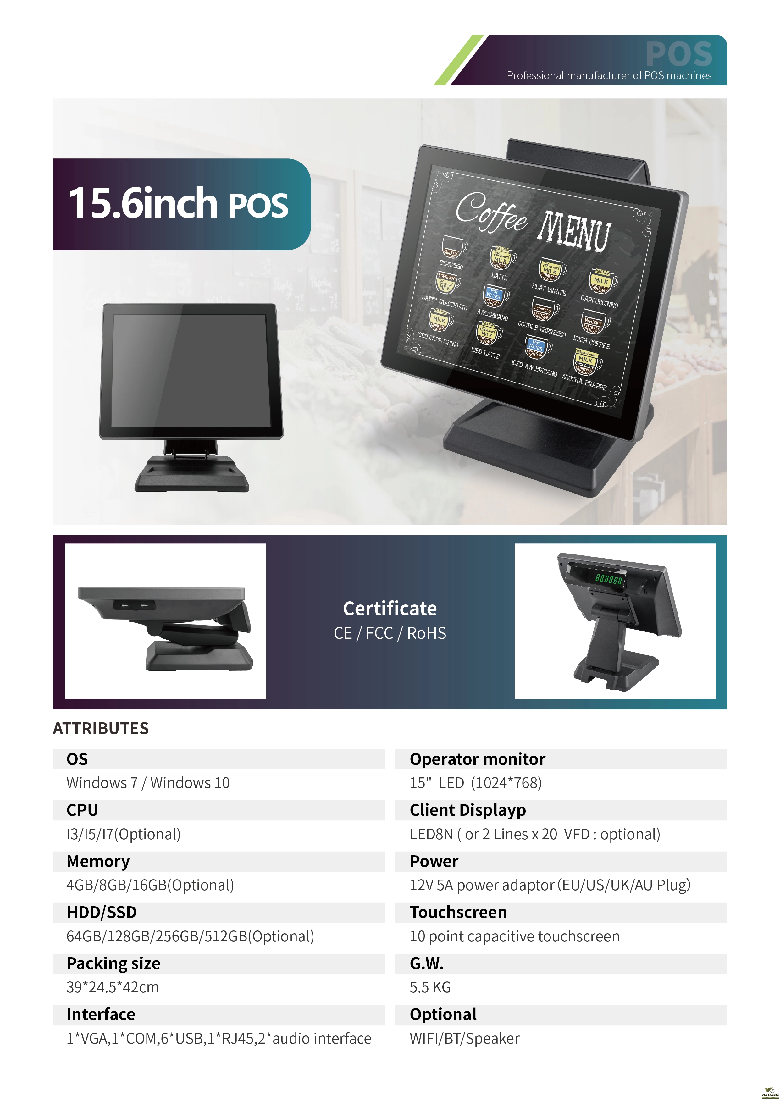 This product link inlcuded 1unit Single Screen POS Machine 15inch based on Windows10 OS,i7 13th generation,memory 16GB RAM+512GB SSD.If you need other configuration for example i3/i5 64GB/128GB/256GB,please contact with our seller.