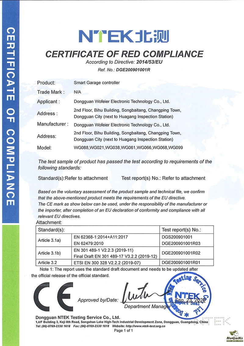 WG-088 Smart Garage controller had met CE ,Certificate No DGE200901001R01 ,If you need the Test report,Declarations of conformity