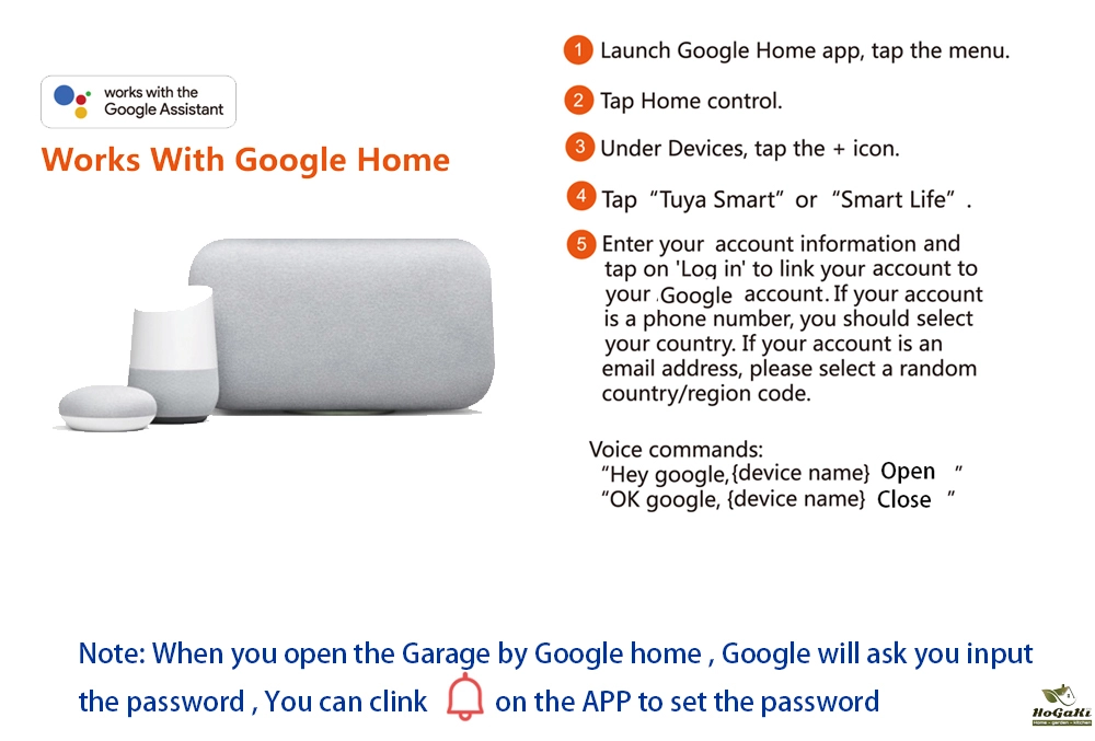 You should add this Garage door controller to work with tuyasmart or smartlife APP , and Binding it with Amazon Alexa or Google Assistant to achieve voice control. We have voice code protection,when you open the Garage door.