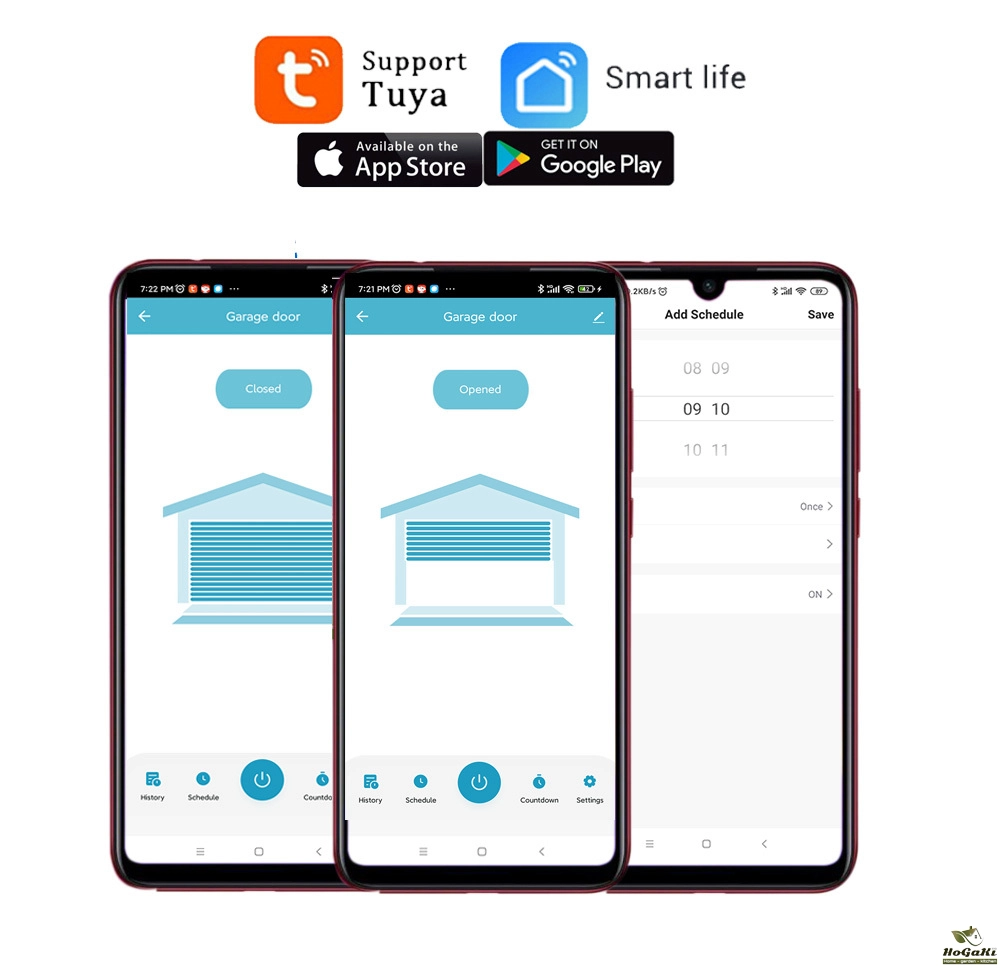 Auto open or close the garage with your schedules or countdown. Automatically detects the status of the garage door more safer without false running.