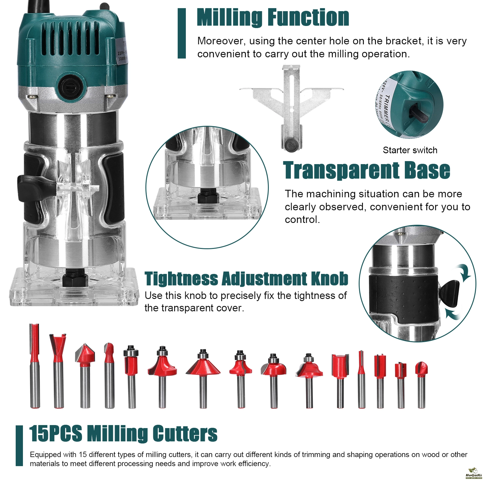 15PCS Milling Cutters: Equipped with 15 different types of milling cutters, it can carry out different kinds of trimming and shaping operations on wood or other materials to meet different processing needs and improve work efficiency.