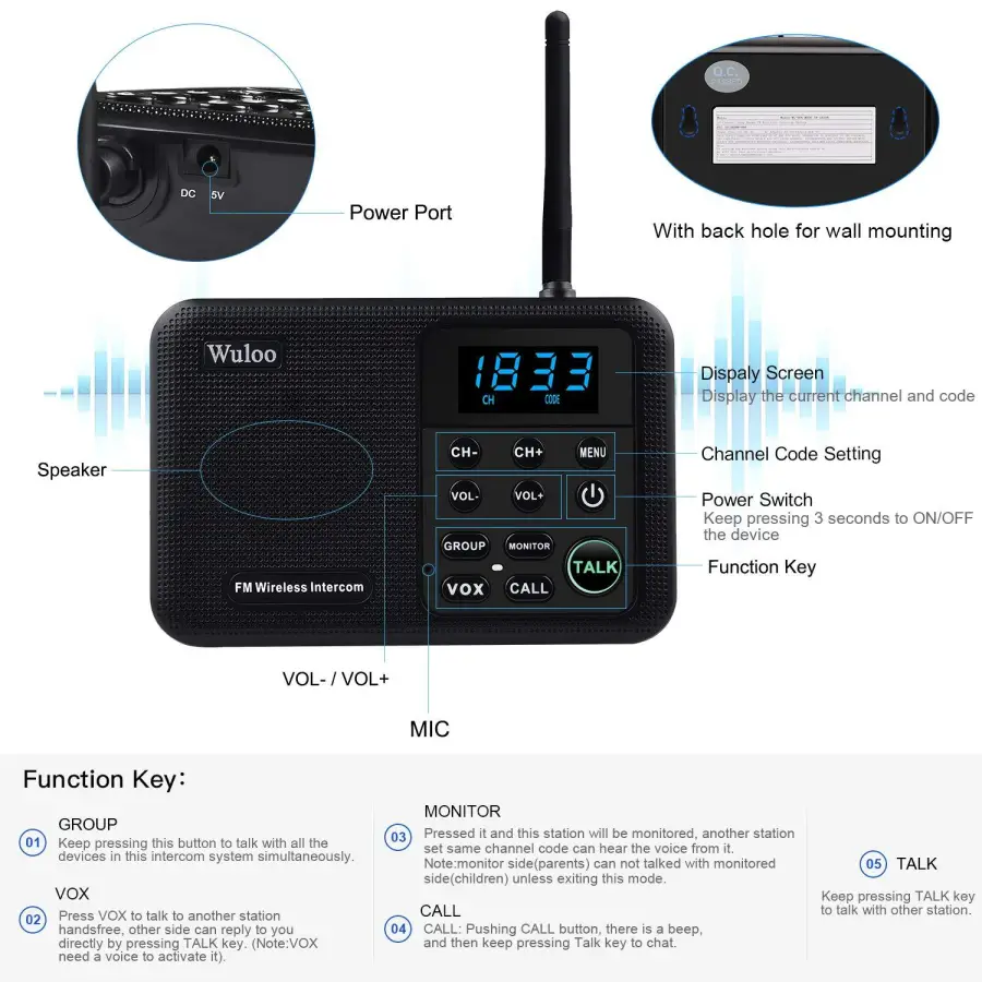 [ Easy to Use with Detailed Manual ] Features include Monitor, Talk, VOX (Voice Operated Exchange), Group, and Calling function. Increase/lower volume too! This intercom system is easier to use than others with user-friendly multi-functions and included step-by-step instructions!