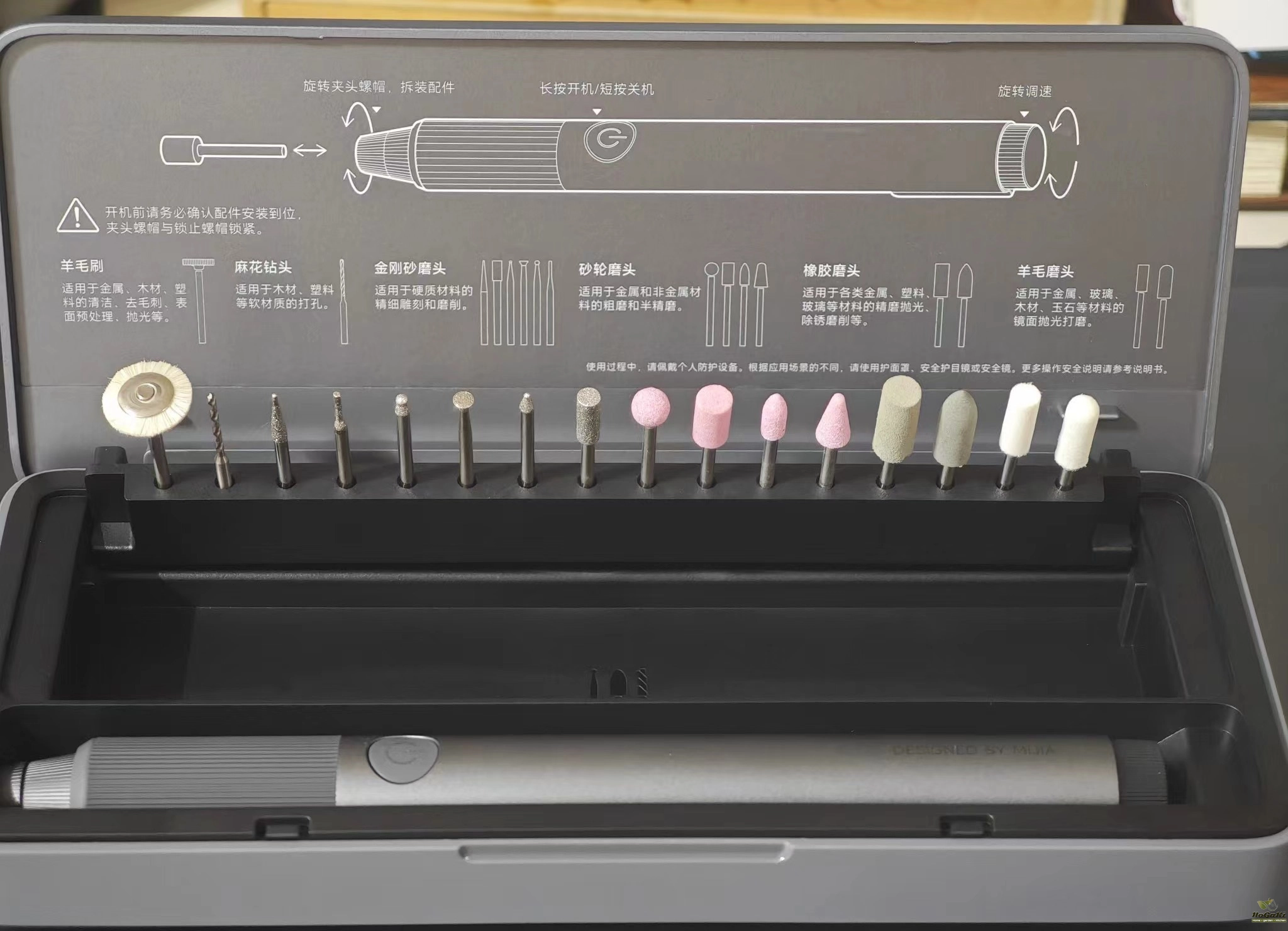 * Automatic pop-up storage box, loaded with 16 high-quality grinding heads with a rod diameter of 2.35mm.