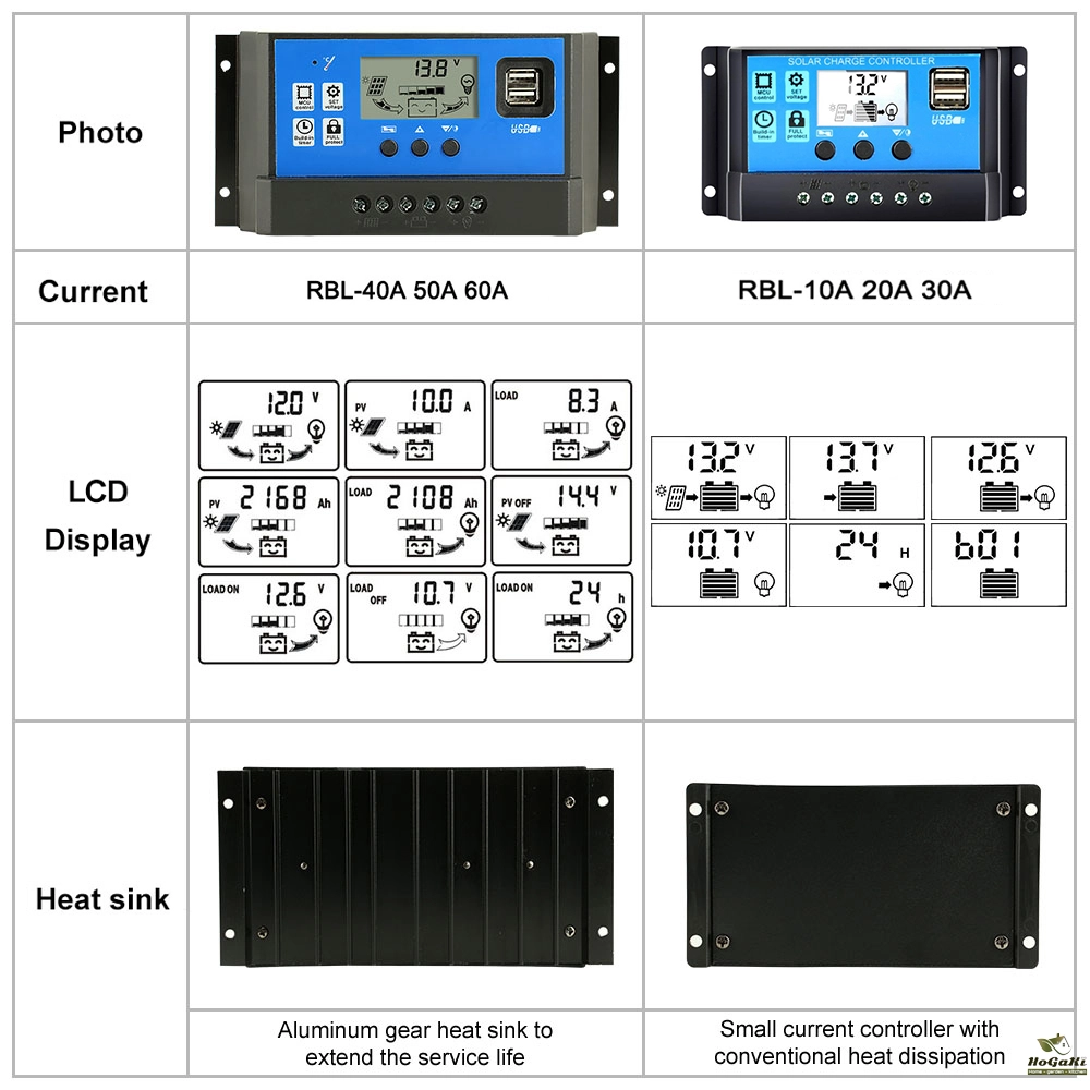RBL-50A : Max PV Voc: 24V (12V), 48V (24V); Max PV Power: 650W (12V), 1300W (24V);