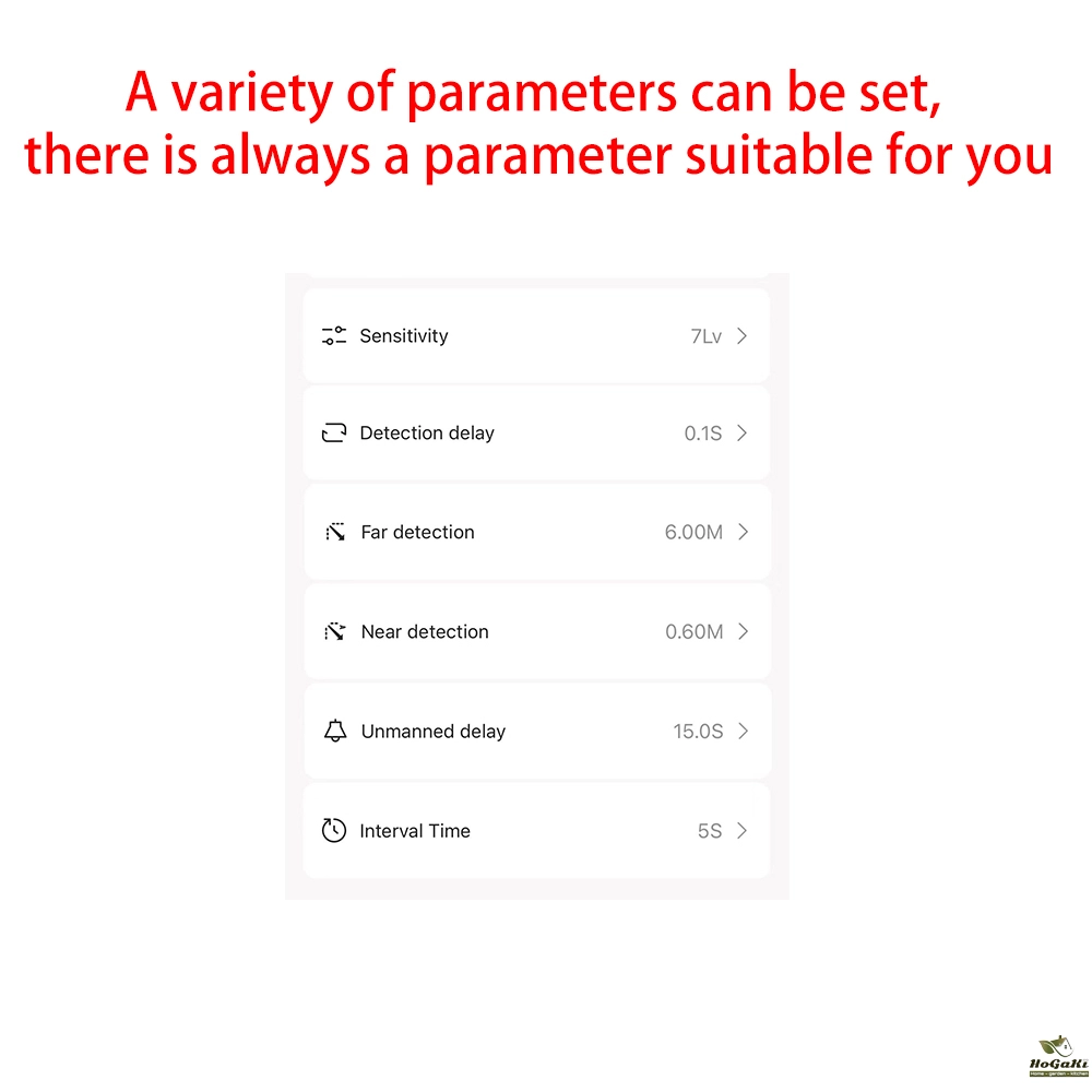 Set the sensitivity from 1-9 to your own need,together with minimum detect range as 0.00m and maximum as 9.5m for flexible detection demand.Meanwhile,it is designed with hold time set as 0-1500s and detection latency set as 0-10s to avoid irrelevant annoying movement and reduce false alarm rate.