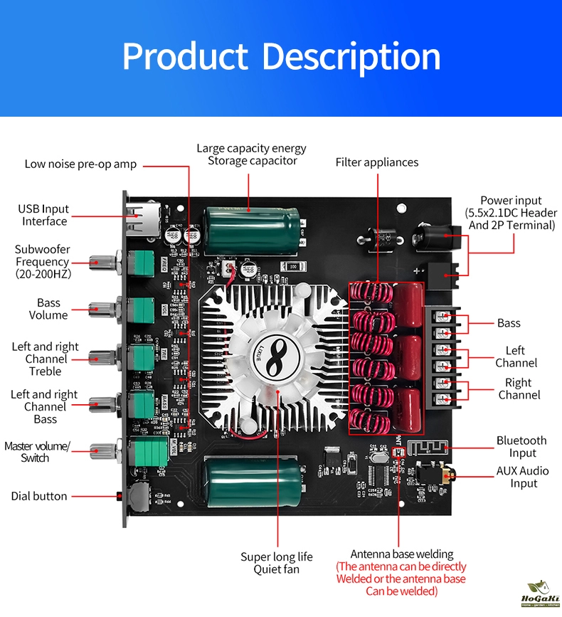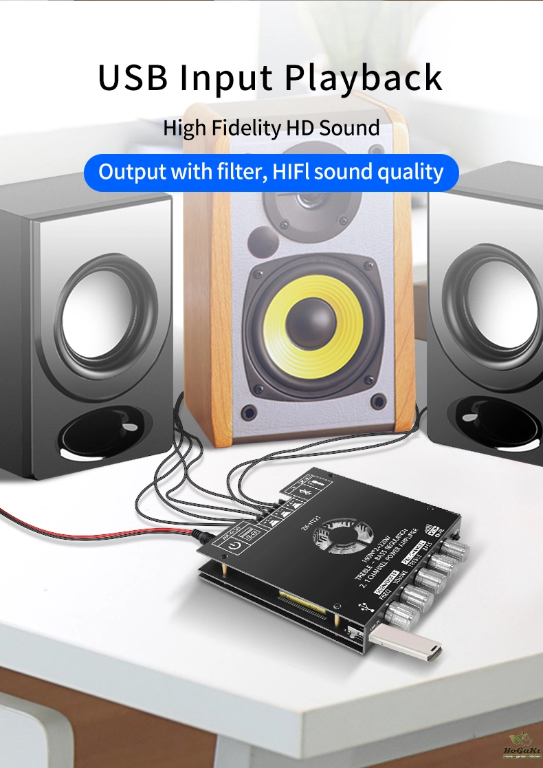 The higher the power supply voltage, the greater the output power, and the smaller the speaker impedance, the greater the output power! Please make sure that the power of the adaptor is greater than the actual working power of the amplifier!