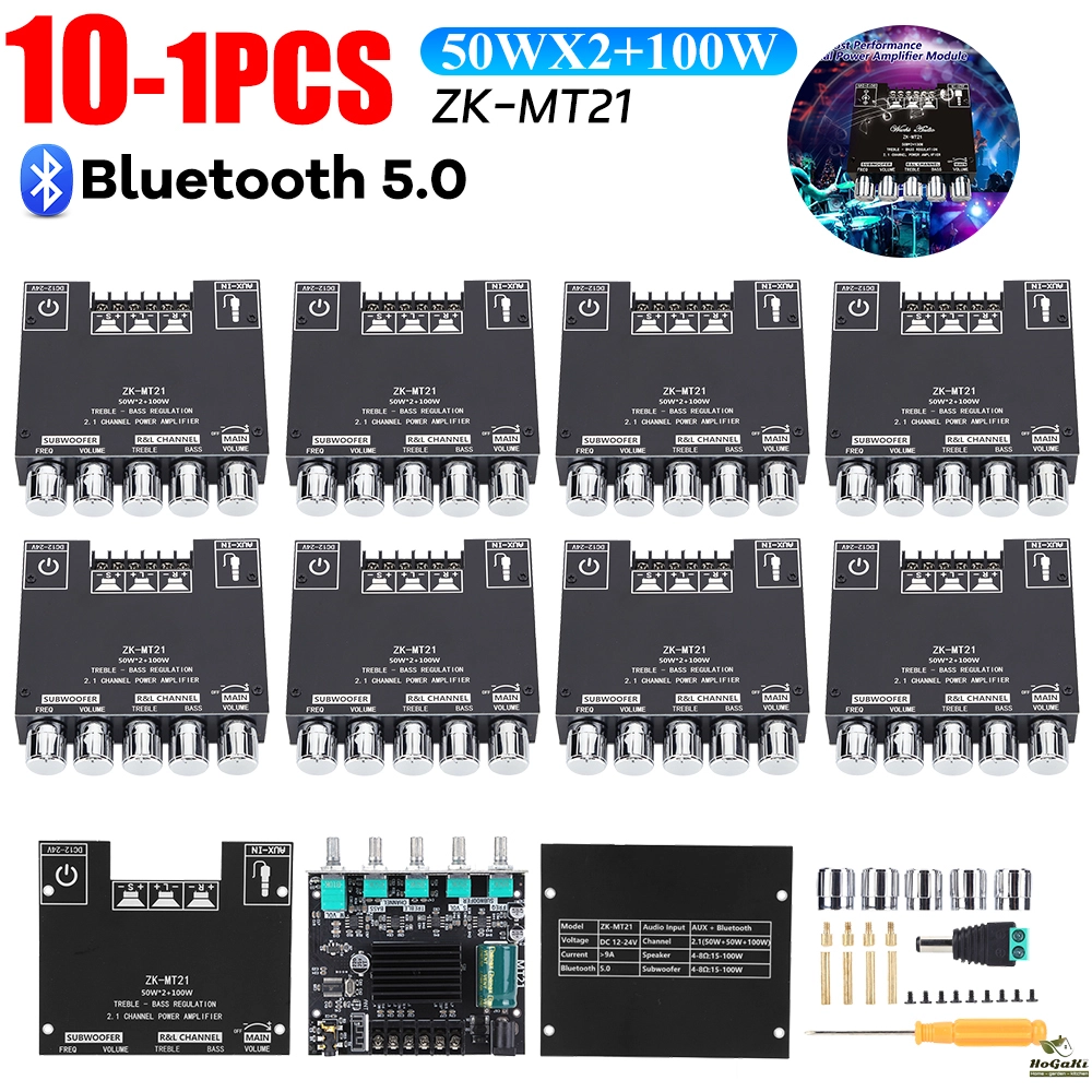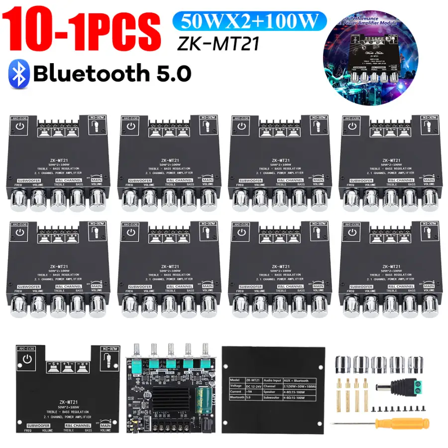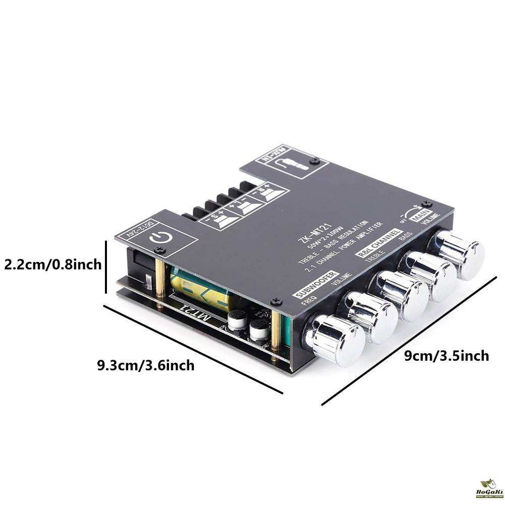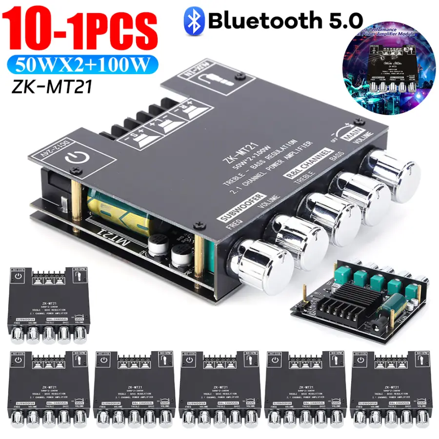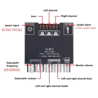 Feature: The Bluetooth-compatible audio power amplifier module has 2.1 channels and the maximum output power is 2X50W+100W. It has two audio input modes, AUX and Bluetooth-compatible, and a two-in-one power amplifier board. Bluetooth-compatible5.0, higher transmission efficiency, longer transmission distance It has short-circuit protection, over-current, over-heating, and anti-reverse protection to prevent total failure. When an overload occurs, the device reports the fault condition to the processor to protect itself from damage It adopts copper DC connectors and barrier terminals. It can withstand high current without heating or damaging wires. Classic appearance multi-function main knob. The main knob adopts a rotary encoder that is only used in high-end power amplifiers, which realizes 360-degree stepless tuning and a smooth one-key start and stop. The operation is simple and convenient by long pressing the switch. With bass, treble, subwoofer frequency and volume control, you can easily adjust the volume and enjoy the music tone you want. It is widely used in shopping malls, home theaters, speakers, etc. Specification: Product name: 2.1 channel Bluetooth-compatible audio power amplifier module Product model: ZK-MT21 Bluetooth-compatible version: 5.0 (unobstructed, 15 meters) Input sensitivity: 500mV Input method: AUX+ Bluetooth-compatible Number of channels: 2.1 channels Power amplifier chip: Domestic power amplifier chip Adapter power supply: above DC12-24V/5A (24V battery pack is not allowed) Adapted speakers: 20-100W, 4-8Q Output power: left and right channels <50W; subwoofer <100W Protection mechanism: Anti-reverse connection, overheating, overcurrent, short circuit protection Product size: 93mm*90mm*22mm Product weight: about 130g Notice: The product can be connected with an external antenna, but does not include an antenna and an antenna base, please purchase it separately. Tip: Only when the audio input is enough and the power supply voltage/current is enough, there will be enough output power!!! The higher the power supply voltage, the greater the output power, and the smaller the speaker impedance, the greater the output power!!! Please make sure that the power of the adapted power supply is greater than the actual working power of the amplifier!!! Note: Due to the different monitor and light effect, the actual color of the item might be slightly different from the color showed on the pictures. Thank you! Please allow 1-2cm measuring deviation due to manual measurement.
