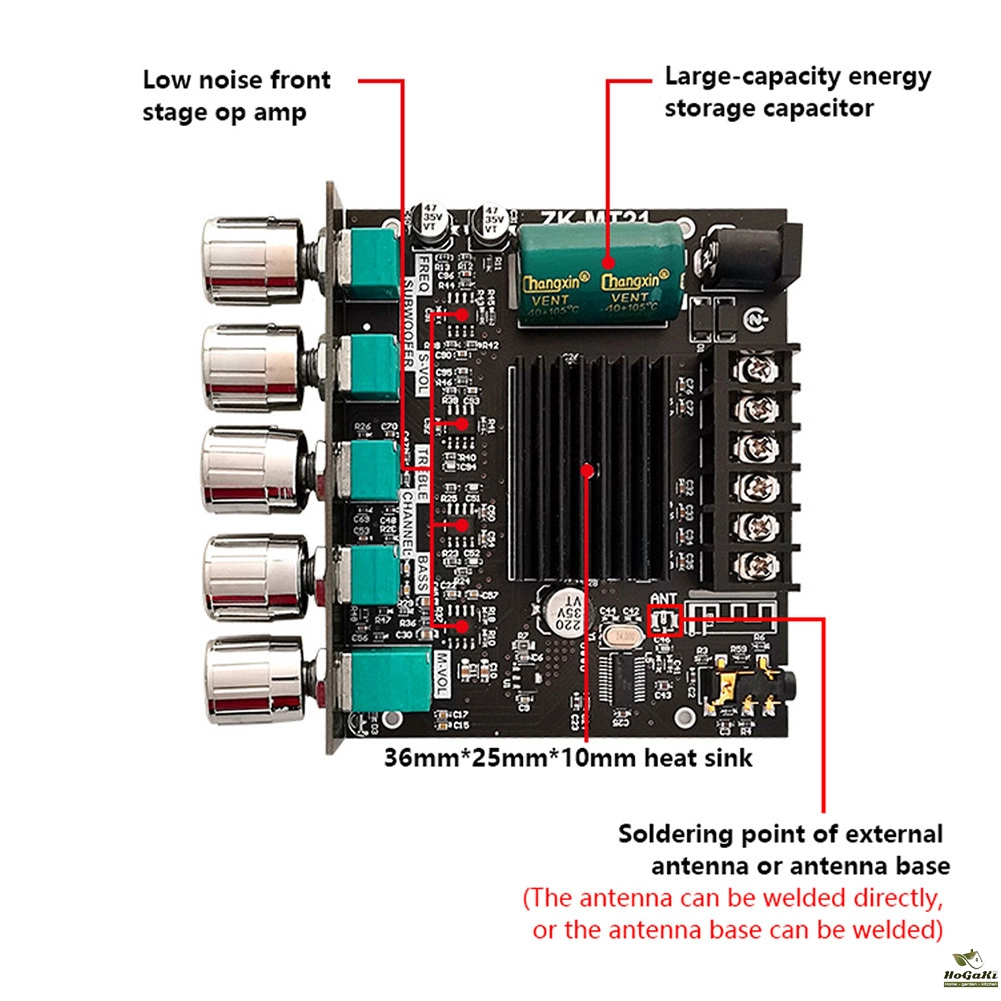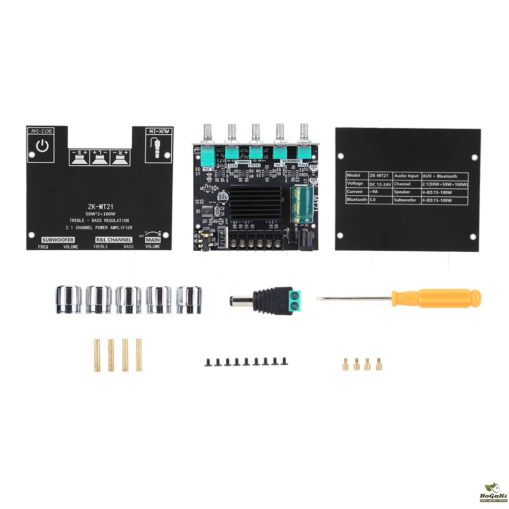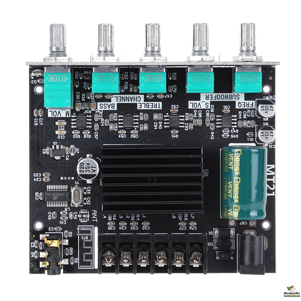 Feature: The Bluetooth-compatible audio power amplifier module has 2.1 channels and the maximum output power is 2X50W+100W. It has two audio input modes, AUX and Bluetooth-compatible, and a two-in-one power amplifier board. Bluetooth-compatible5.0, higher transmission efficiency, longer transmission distance It has short-circuit protection, over-current, over-heating, and anti-reverse protection to prevent total failure. When an overload occurs, the device reports the fault condition to the processor to protect itself from damage It adopts copper DC connectors and barrier terminals. It can withstand high current without heating or damaging wires. Classic appearance multi-function main knob. The main knob adopts a rotary encoder that is only used in high-end power amplifiers, which realizes 360-degree stepless tuning and a smooth one-key start and stop. The operation is simple and convenient by long pressing the switch. With bass, treble, subwoofer frequency and volume control, you can easily adjust the volume and enjoy the music tone you want. It is widely used in shopping malls, home theaters, speakers, etc. Specification: Product name: 2.1 channel Bluetooth-compatible audio power amplifier module Product model: ZK-MT21 Bluetooth-compatible version: 5.0 (unobstructed, 15 meters) Input sensitivity: 500mV Input method: AUX+ Bluetooth-compatible Number of channels: 2.1 channels Power amplifier chip: Domestic power amplifier chip Adapter power supply: above DC12-24V/5A (24V battery pack is not allowed) Adapted speakers: 20-100W, 4-8Q Output power: left and right channels <50W; subwoofer <100W Protection mechanism: Anti-reverse connection, overheating, overcurrent, short circuit protection Product size: 93mm*90mm*22mm Product weight: about 130g Notice: The product can be connected with an external antenna, but does not include an antenna and an antenna base, please purchase it separately. Tip: Only when the audio input is enough and the power supply voltage/current is enough, there will be enough output power!!! The higher the power supply voltage, the greater the output power, and the smaller the speaker impedance, the greater the output power!!! Please make sure that the power of the adapted power supply is greater than the actual working power of the amplifier!!! Note: Due to the different monitor and light effect, the actual color of the item might be slightly different from the color showed on the pictures. Thank you! Please allow 1-2cm measuring deviation due to manual measurement.