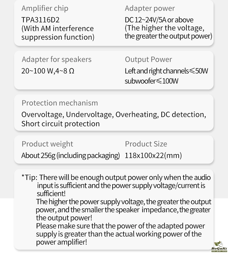 • TPA3116D2 Chip :The TPA3116D2 chip ensures high-quality audio processing, providing clear and crisp sound with minimal distortion.